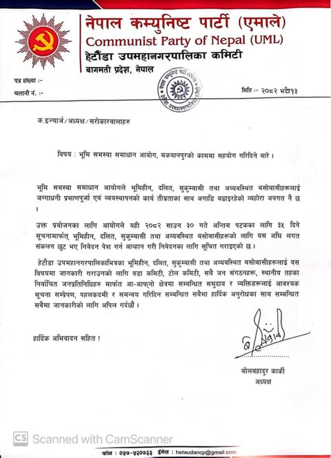भूमि समस्या समाधान आयोगको कामलाई सफल पार्न एमाले हेटौँडाको आग्रह