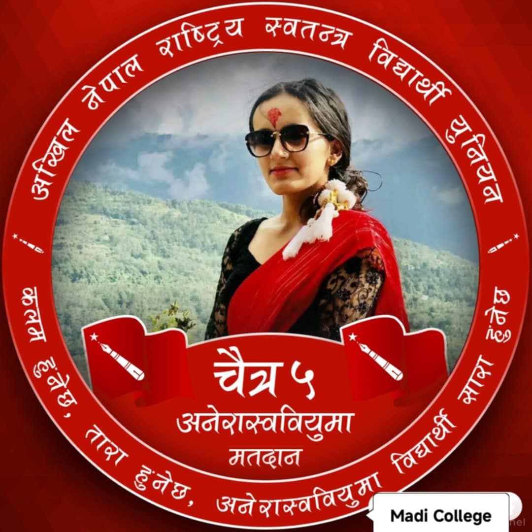 संखुवासभा । चैत ५ गते हुने स्वतन्त्र विद्यार्थी युनियनको चुनावमा संखुवासभाको मादी नगरपालिकामा रहेको मादी बहुमुखी क्याम्पसको विद्यार्थी संगठन अखिल नेपाल राष्ट्रिय स्वतन्त्र विद्यार्थी युनियन ( अनेरास्ववियु ) को तर्फबाट स्ववियु अध्यक्ष ( सभापति ) पदको उम्मेद्वारमा भिम कुमारी कार्की ( अनु ) लाई अगाडी सारेको छ। फागुन २३...